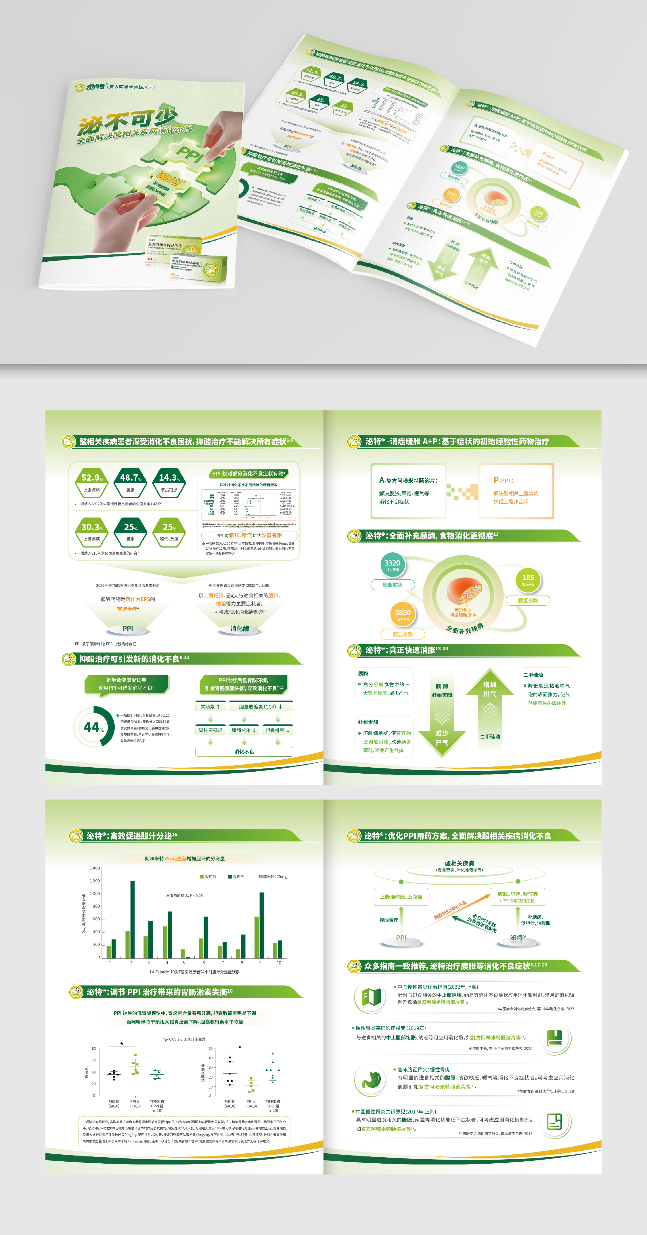 先定手册的折叠方式,“泌特绿”焊死在设计里!浅绿当背景像铺了层嫩草坪,深绿勾标题和边框当“绿化带”,再扒拉点拼图、肠胃示意图当“小装饰”,连图标都裹着绿边儿,生怕别人不知道这是泌特专属手册。