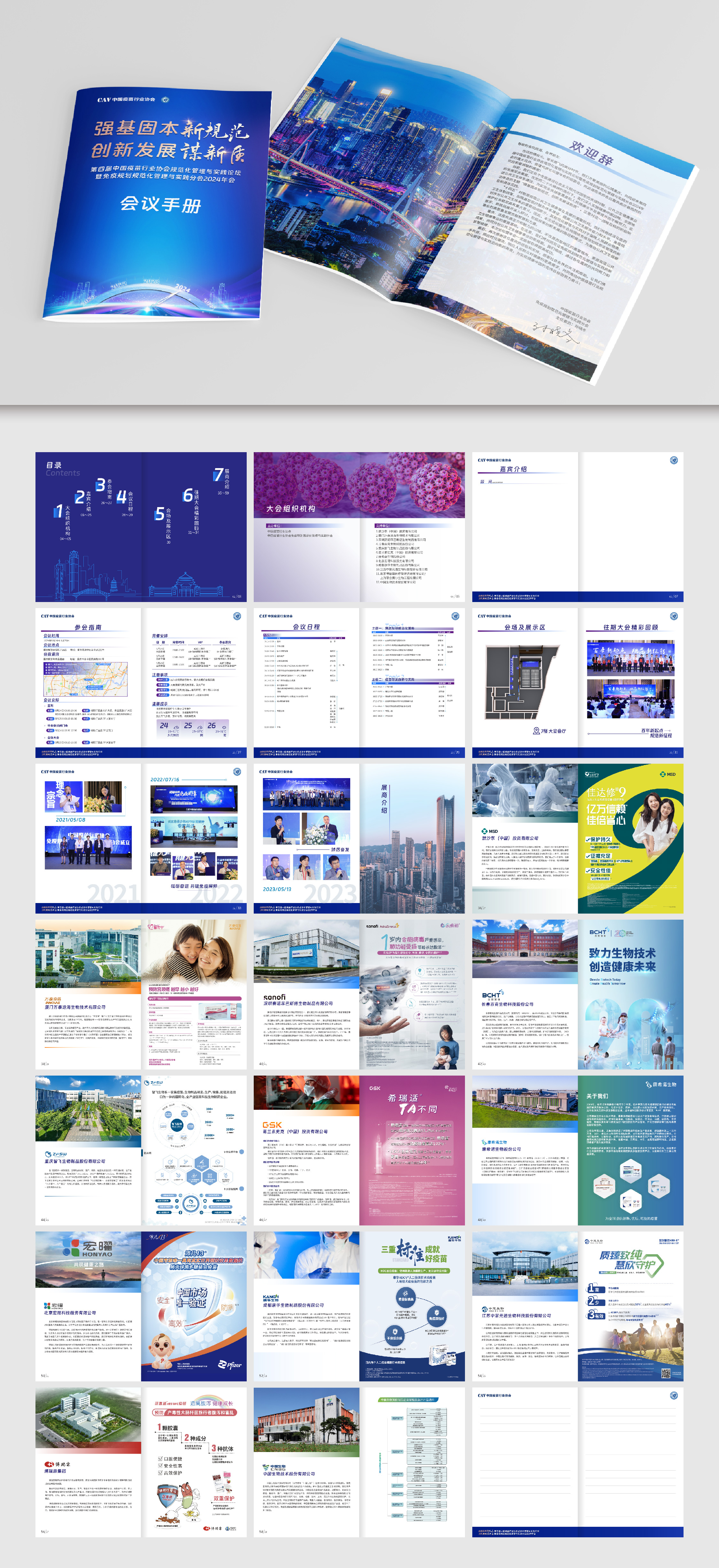 会议手册是“参会生存宝典”,需含会议指南、日程、场地分布、往期回顾、合作品牌等内容,风格统一科技蓝+渐变紫,专业不枯燥,实用不复杂。把手册设计融入延展画面体系,突出实用性与视觉统一性。手册是制作物料中的大头,不能搞“手册没人看,海报堆成山”的尴尬场面。