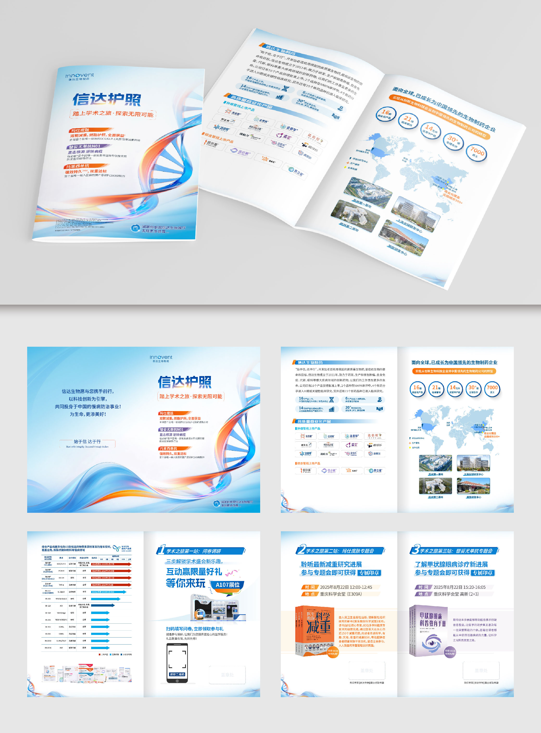 采用品牌主色调 “信达蓝”,搭配渐变的浅蓝与活力橙,既体现生物科技的专业感与未来感,又通过暖色调传递温度与亲和力。视觉元素融入DNA双螺旋结构与流动的渐变线条,象征生命科学的本质与创新药物研发的动态过程,强化品牌的科技属性。